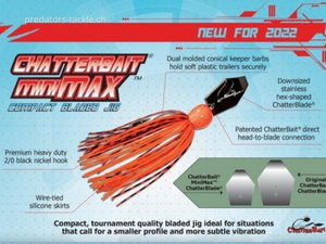 Wenn die Egli mal keinen grossen Hunger haben oder eher halbstarke Streifenräuber zu erwarten sind, dann schlägt seine Stunde: Der Chatterbait Mini Max von Z-Man bietet wie seine grossen Brüder das ganze Paket an unwiderstehlichen Reizen - aber halt zwei Nummern kleiner! Trotz geringer Grösse verfügt der Chatterbait Min Max über einen stabilen Haken, der auch den Kontakt mit Hechten nicht scheuen muss.