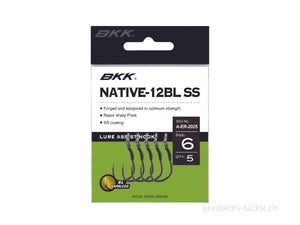 Der BKK Native-12BL SS ist die widerhakenlose Version des Native-12 BL SS, eines Hilfshakens, der als Ersatz für herkömmliche Drillinge und Einzelhaken entwickelt wurde, wenn eine Reduzierung der Torsionskräfte am meisten benötigt wird.