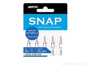 The BKK Duolock Snap Swivel-51 features our original Duolock Snap and a smooth-running stainless steel swivel to avoid torsional forces on the line. Thanks to the robustness of the stainless steel, even smaller swivels are equipped with remarkable strength and can therefore withstand the pull of larger fish.