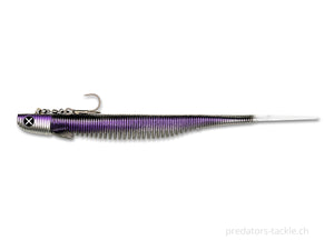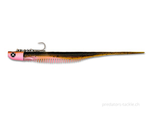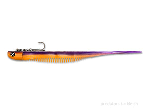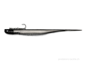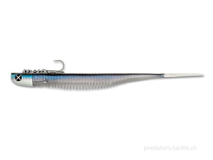 Monkey Lures Stalking Lui 25cm 50g - 1 poisson caoutchouc monté - L'appât caoutchouc de Monkey Lures est un poisson caoutchouc « Prêt à pêcher » qui mesure 25 cm de long. C'est un poisson en caoutchouc mince à queue en V conçu pour la pêche pélagique. Bien entendu, vous pouvez également utiliser l'appât pour la pêche verticale. L'appât est pré-assemblé avec une tête de vis de 50 g, ce qui crée un aspect harmonieux en termes de couleur avec l'assemblage de l'appât en caoutchouc. Un hameçon triple solide au niveau de la tête complète l'appât et assure un hameçon sûr dans la bouche du prédateur.