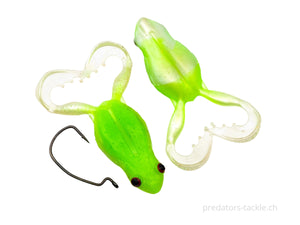 Der Chasebaits Flexi Frog verfügt über präzise Details, die Barschen ein ultrarealistisches Ziel bieten. Auf dem Körper befinden sich dreidimensional gemalte Augen, Grübchen entlang des Oberkörpers und eine Reihe geformter Arme, die in einer Schwimmposition seitlich angebracht sind. Um den Effekt zu verstärken, verfügt der Flexi Frog über ein Paar flatternder Beine