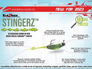 Le StingerZ de 2" de Z-Man est une forme de leurre exclusive à Z-Man avec un profil de queue droit et segmenté unique pour les shads. Le corps épais en forme de shad est doté d'une fente pour crochet pratique pour un montage facile. La queue segmentée se déplace dans une vague. -like et tremble constamment, qui est activé par le stinger. Le StingerZ 2" s'adapte parfaitement aux têtes plombées Micro Finesse ShroomZ et est idéal pour pêcher au lancer et à la récupération horizontalement ou sous un montage flottant, avec la queue remuant et flottant de manière séduisante.