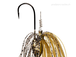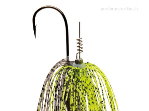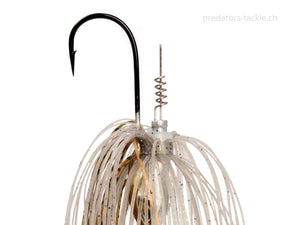 Le MZ RNNR taille M est équipé d'un Willowblade à roulement à billes et est disponible en deux poids différents. La lame crée non seulement d'incroyables ondes de pression qui peuvent être ressenties par les prédateurs même à distance, mais elle crée également de superbes reflets lumineux qui provoquent directement les morsures. Le fil robuste maintient tout en place et forme une connexion stable entre les composants. Grâce à sa tête surbaissée, le MZ RNNR a un centre de gravité bas, ce qui lui confère une conduite très stable. Personne ne peut échapper au regard agressif de cet appât et constitue donc une autre cible pour les prédateurs. Une jupe volumineuse vibre et donne à l'appât une silhouette encore plus grande, tout en dissimulant l'hameçon de manière fiable. Le point fort de l'appât est caché sous la jupe frangée. Un baitcrew vous permet de monter votre trailer facilement et augmente la durée de vie de vos softbaits car l'appât ne s'arrache pas de l'hameçon par les coups violents portés à la tête pendant le combat. Cela signifie que vous pouvez déjouer en toute sécurité plusieurs prédateurs avec un caoutchouc plus souple et en même temps disposer d'une remorque plus mobile et garantissant encore plus de morsures.