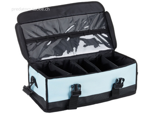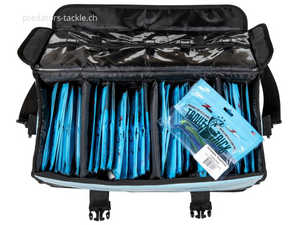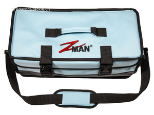 Le grand sac Bait LockerZ de Z-Man est fabriqué dans un tissu 600 deniers résistant et imperméable et offre suffisamment d'espace pour plus de 50 paquets d'appâts souples ElaZtech. Il est équipé de séparateurs réglables afin que les paquets puissent être soigneusement triés. Le rabat supérieur est doté de fermetures magnétiques et empêche le couvercle de s'ouvrir. Les compartiments intérieurs transparents avec fermetures Velcro offrent un espace de rangement supplémentaire pour les gabarits, les hameçons et les appâts. La poche extérieure en filet peut contenir facilement des objets plus gros tels que des outils et des bobines d'amorce. Une base caoutchoutée robuste empêche de glisser sur le pont et garde le contenu au sec. Pour un transport facile, le Bait LockerZ Tadche est doté d'une poignée et d'une bandoulière en nylon. De plus, le sac ne contient aucune pièce métallique susceptible de rouiller.