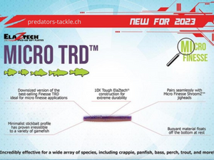 Der 1.75" Micro TRD von Z-Man ist klein genug, dass er mühelos von Barschen, Forellen und allen anderen Fischarten inhaliert werden kann. Er verfügt über das bewährte TRD-Stickbait-Profil in einer Grösse von knapp 4,5 cm . Die 10X Tough ElaZtech-Zusammensetzung bedeutet, dass der Micro TRD Dutzenden von Angriffen und Fängen pro Köder standhält. Das extra weiche, schwimmfähige Material steigt in der Ruhephase vom Grund auf und sorgt dafür, dass der Micro TRD ständig Aufmerksamkeit erregt. Passt perfekt zu den Z-Man Micro Finesse ShroomZ Jigköpfen.